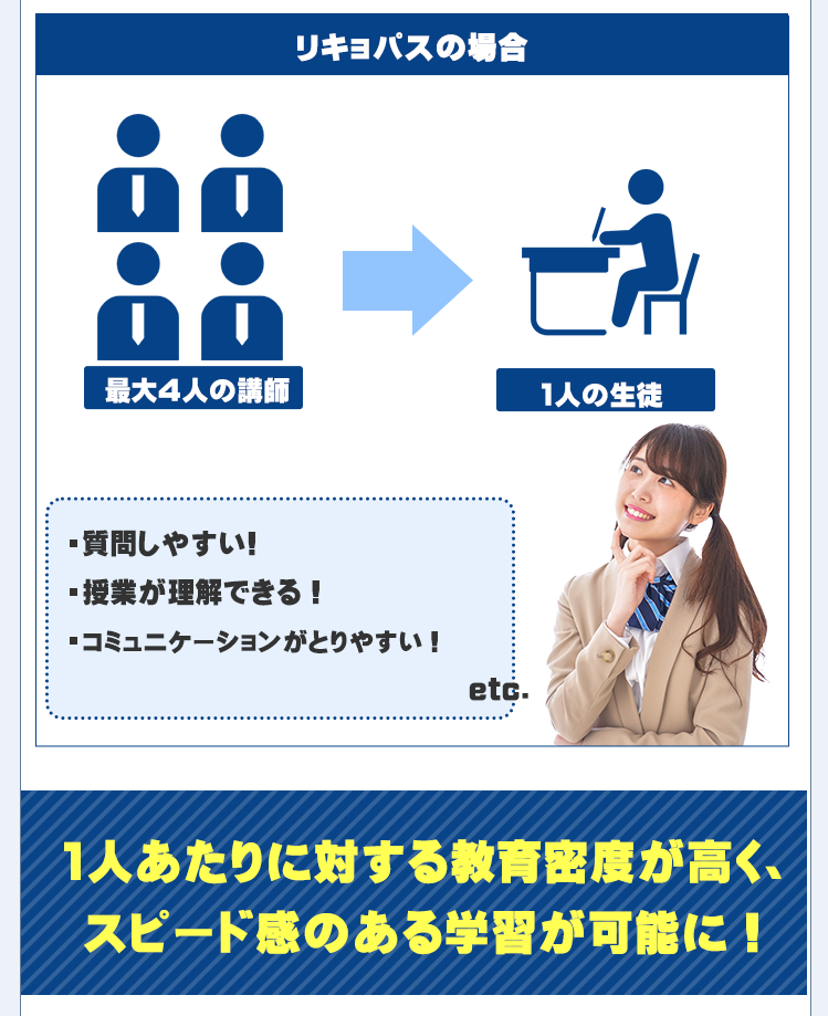 1人あたりに対する教育密度が高くスピード感のある学習が可能になります。
