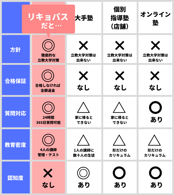 近くに予備校がない受験生、は今一度立教大学専門塾RIKYO-PASS(リキョパス)をお考え下さい。